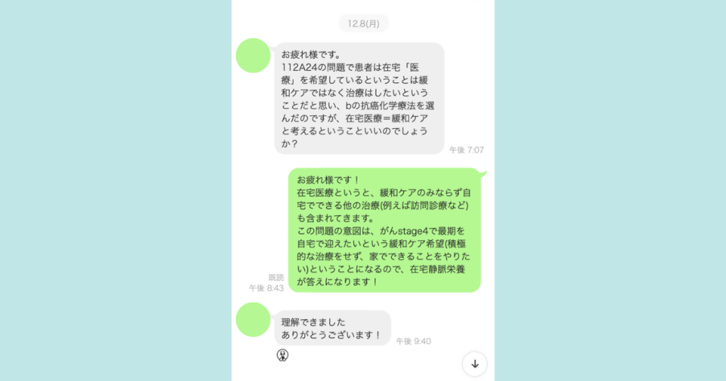無料相談会で国試の開示点数と苦手科目について分析してもらったところ、循環器や内分泌、血液など病態生理の理解が大事になる科目でつまずいていることに気づかされました。これまではなぜこれらの科目が苦手なのか気がつきませんでしたが、理解する必要がある部分を暗記に頼ってしまっていたことに気がつき、勉強法が大きく変わりました。