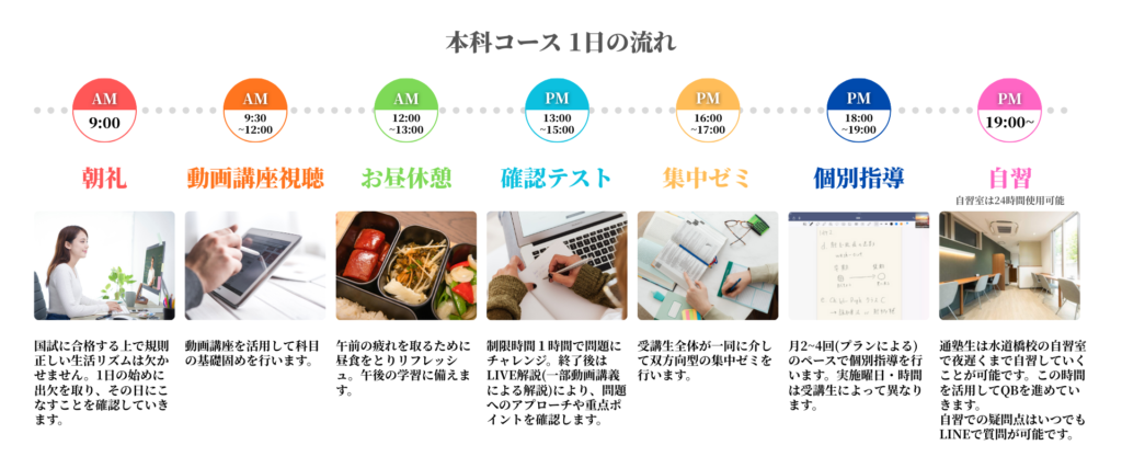 | その他 | 朝礼、国試出願サポート、マッチング対策(出願戦略、面接対策等)、LINEによる学習質問サポート、自習室利用(プレミアムプランのみ)チューターによる生活・メンタルサポート、等 |