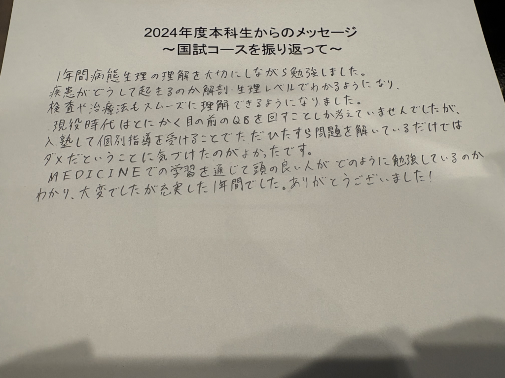 理解を大切にする勉強を4月から続けたところ、10月の模試では及第点が取れ、不合格時と比べて50点近く伸びました。MEDICINEの先生方に習えて良かったとともに、もっと早く指導していただいていればと感じました。ありがとうございました!